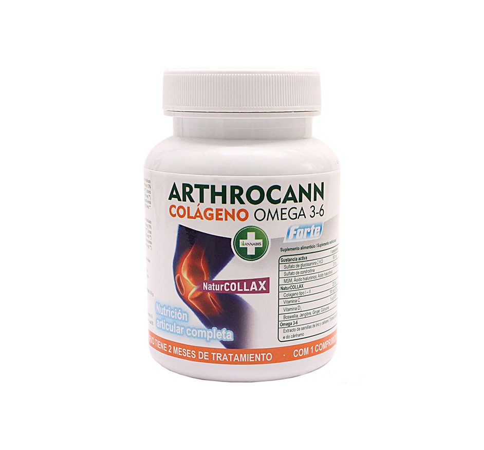O Arthrocann Colagénio Omega 3-6 Forte serve para o desempenho físico de adultos, especialmente para atletas e idosos. O Arthrocann Colagénio é formado pelo complexo NaturCOLLAX em simbiose com sulfato de glucosamina 2KCl, sulfato de condroitina, MSM e ácido hialurónico. O complexo NaturCOLLAX contém um colágeno tipo I certificado, colágeno tipo II, vitaminas C e D₃, gengibre, boswellia e Açafrão. O colágeno é um dos componentes básicos da cartilagem articular. A vitaminas C é necessária para preservar o desenvolvimento normal dos ossos e das cartilagens. Os componentes mais importantes do Arthrocann Colagénio são o ômega 3 e 6, os ácidos gordos insaturados e as sementes de linho e de cânhamo.