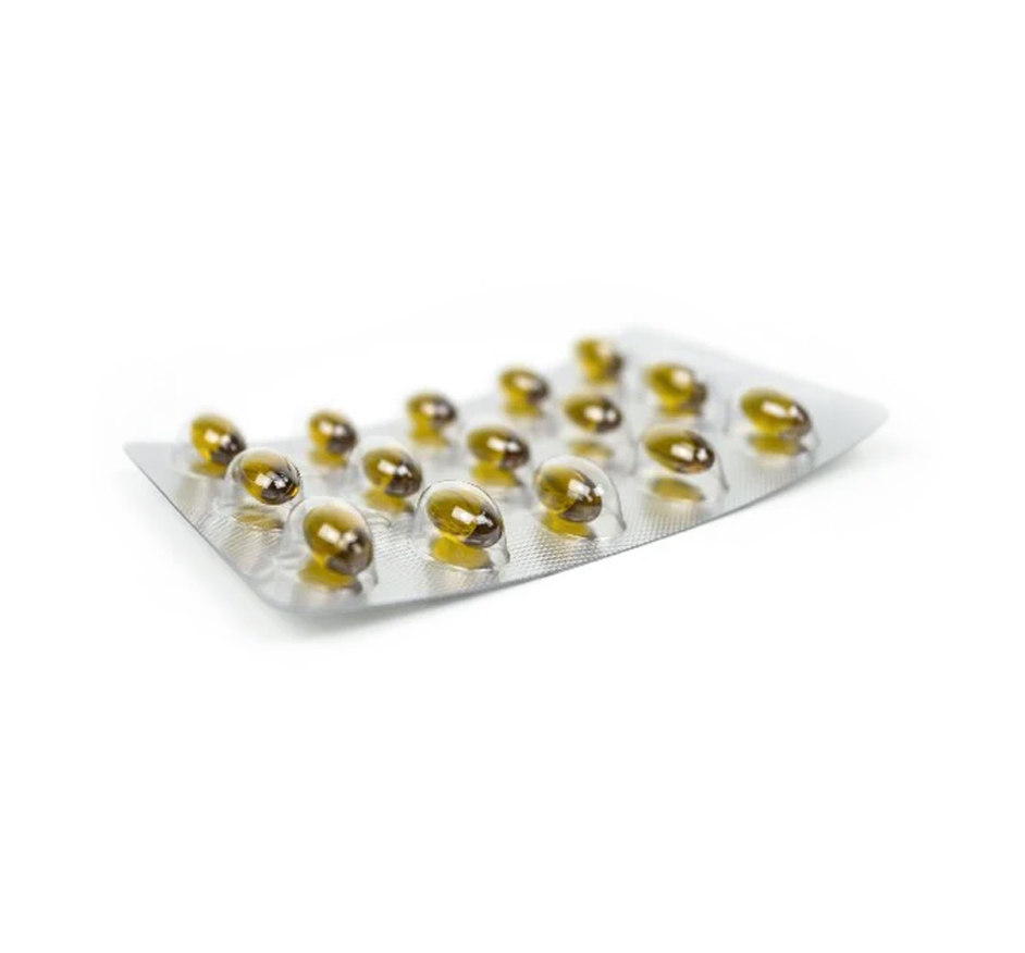 • Blister com cápsulas amarelas gelatinosas em fundo branco