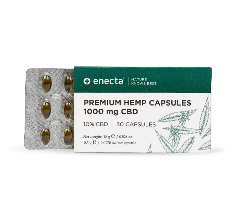 • Caixa e blister de cápsulas premium de cânhamo enecta 1000 mg CBD