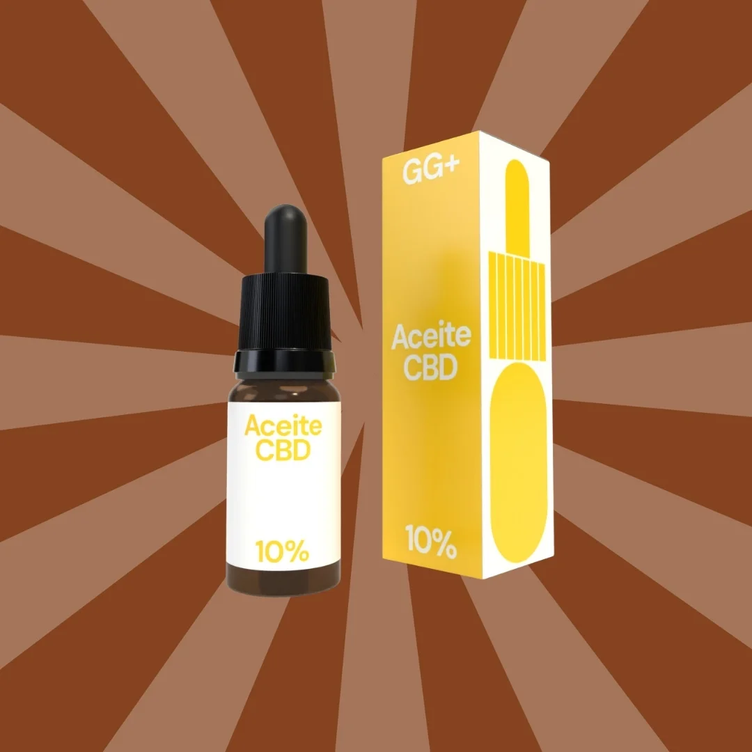 • Frasco de aceite CBD com conta-gotas e caixa amarela e branca
