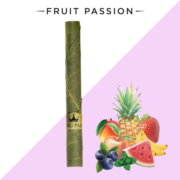 • Charuto verde com anel KING PALACE ao lado de ilustrações de frutos variados, fundo branco e lilás.
