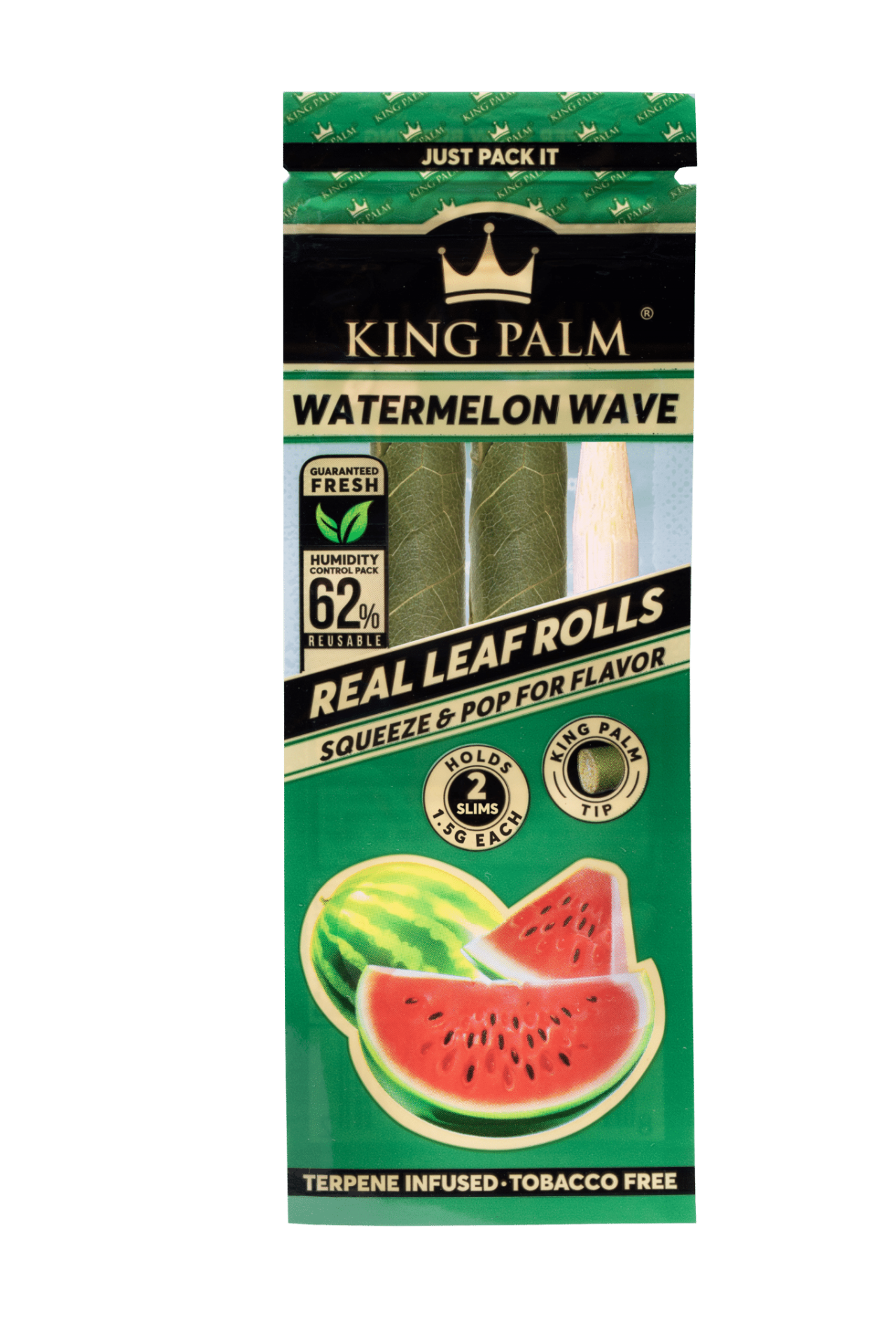 • Embalagem verde e preta de folhas reais para fumar King Palm Watermelon Wave com sabor a melancia