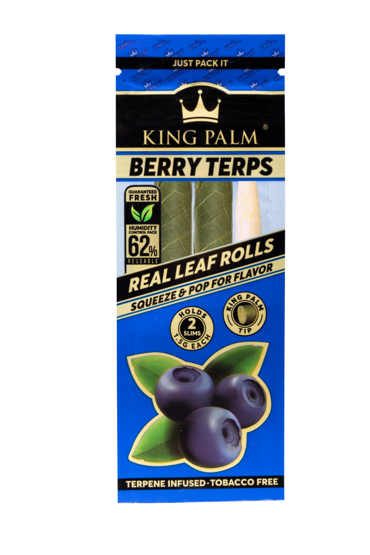 • Embalagem azul e preta King Palm Berry Terps com imagem de bagas e texto promocional.