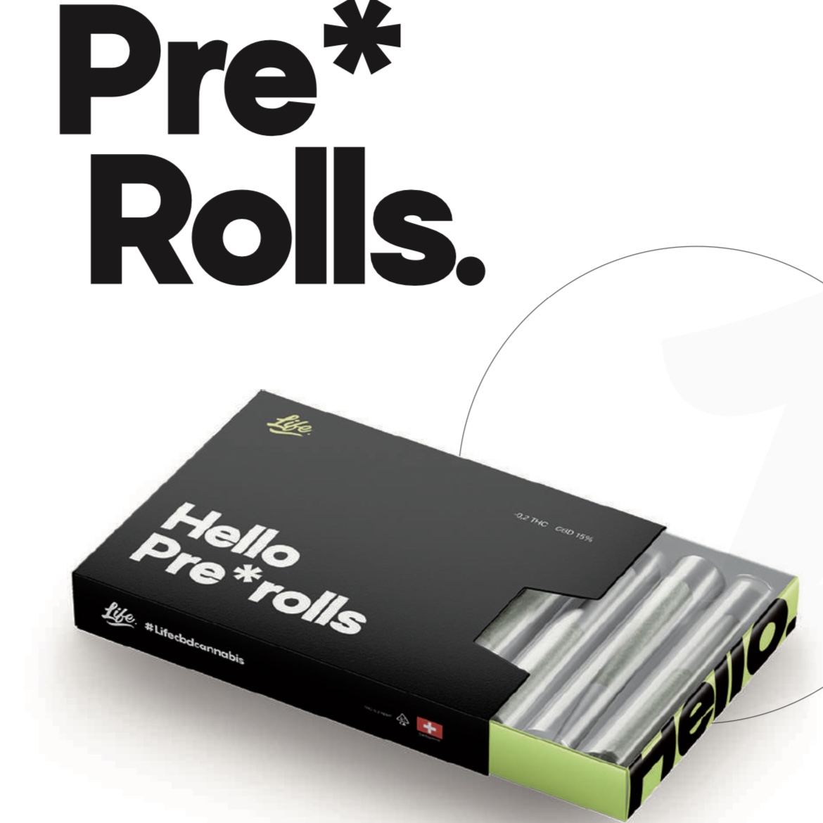 •  embalagem preta Hello Pre*rolls com cigarros pré-rolados visíveis e detalhes verdes