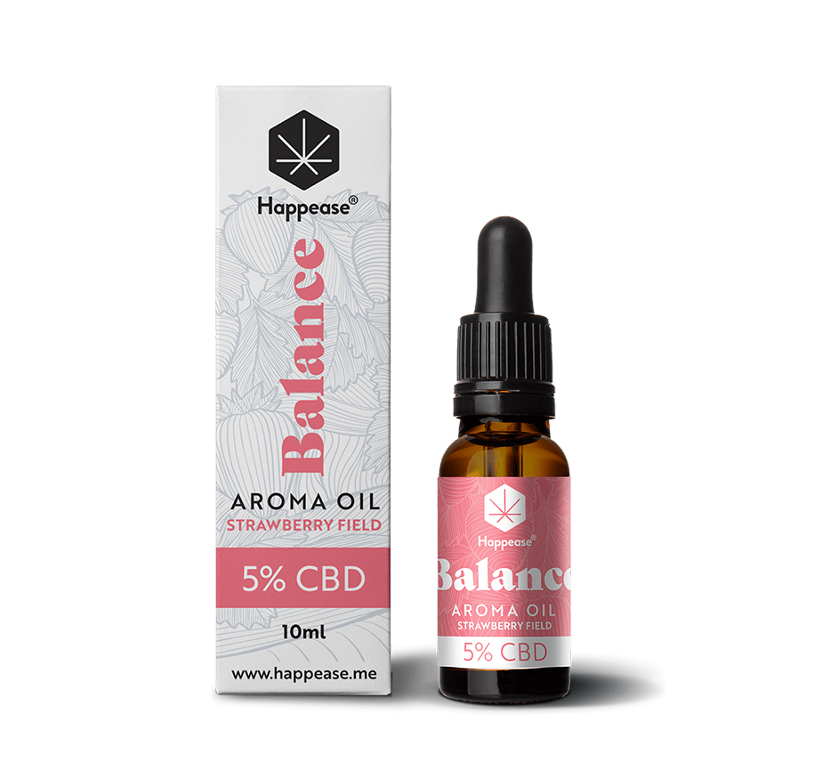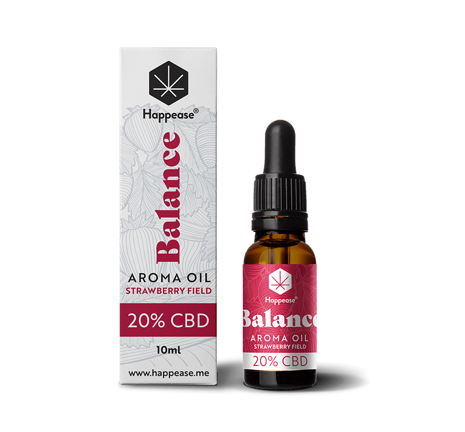 • Frasco e caixa de óleo aroma Balance Strawberry Field 20% CBD