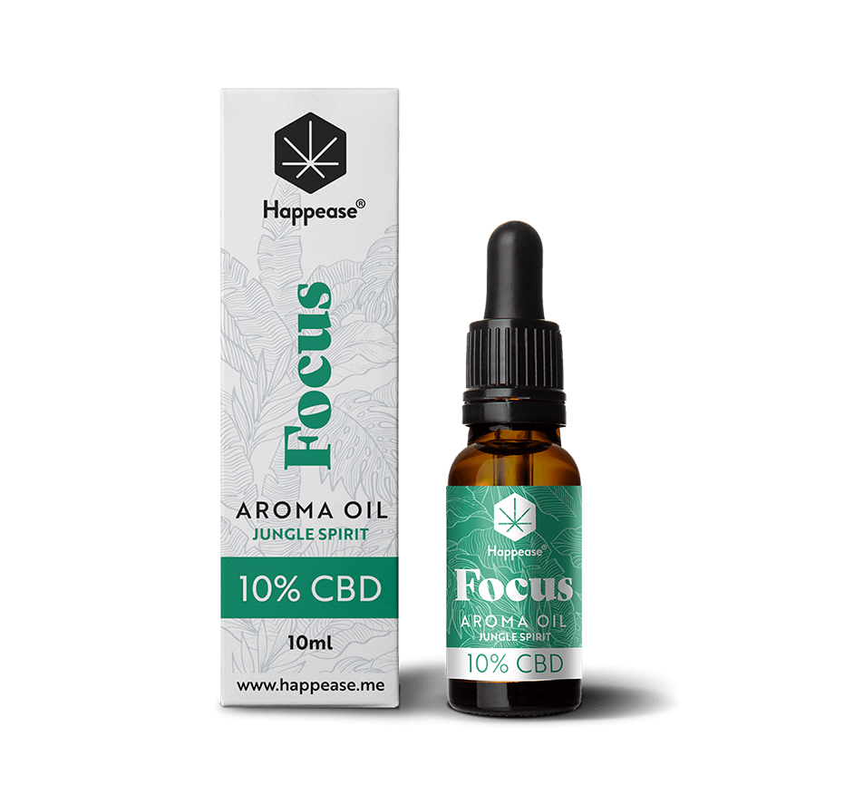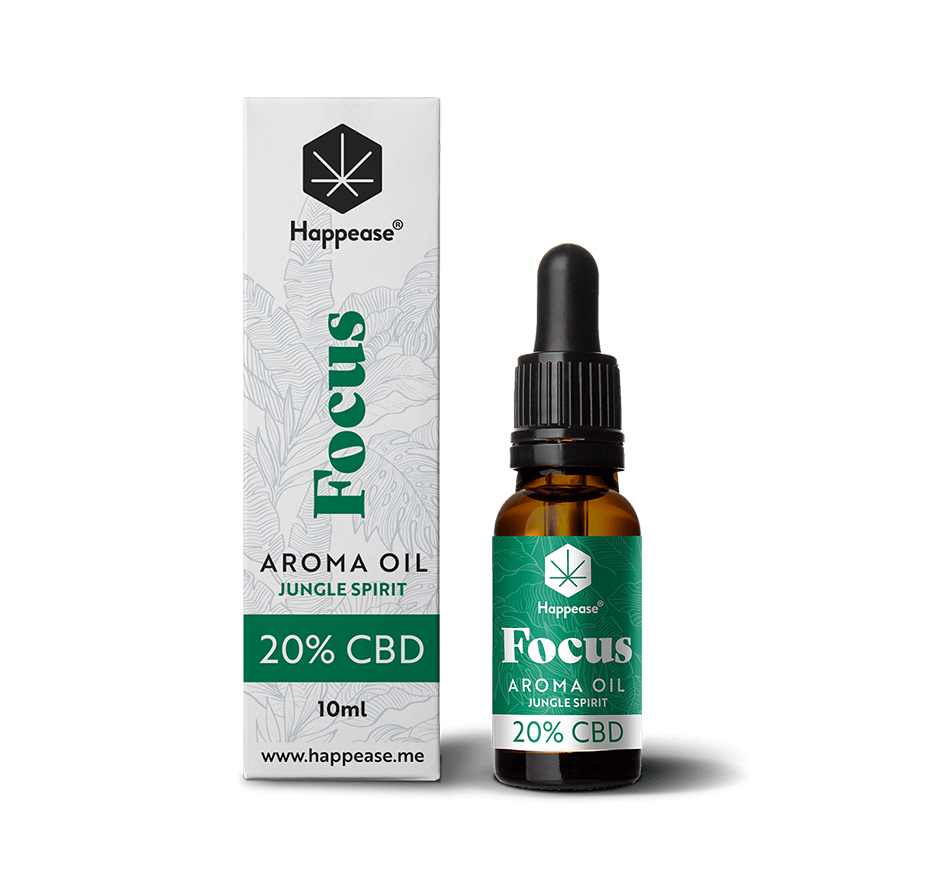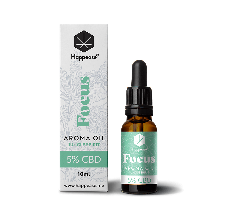 • Frasco e embalagem de óleo aromático Focus 5% CBD da Happease