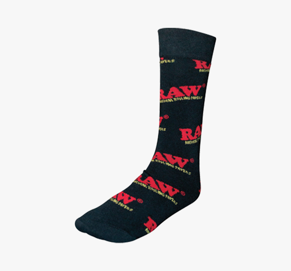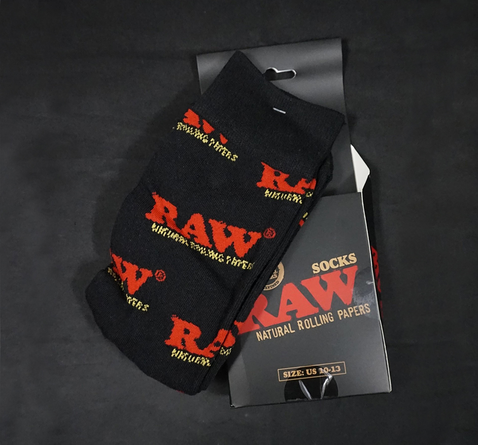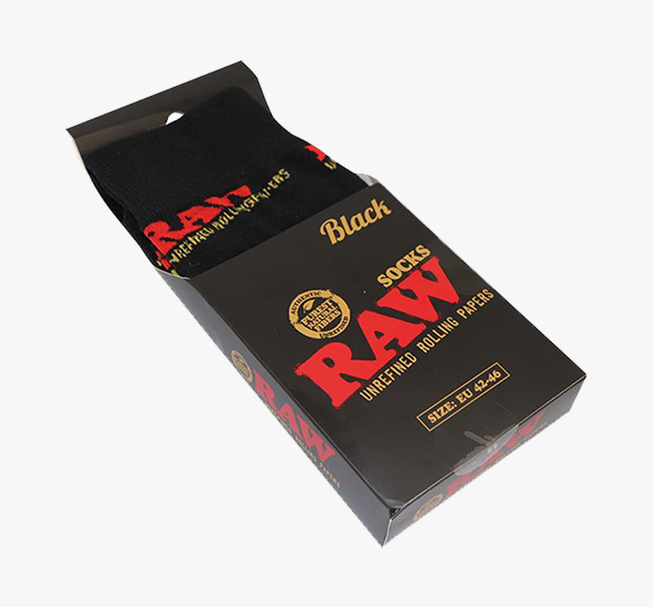 • Meias pretas RAW com embalagem preta e texto vermelho e amarelo