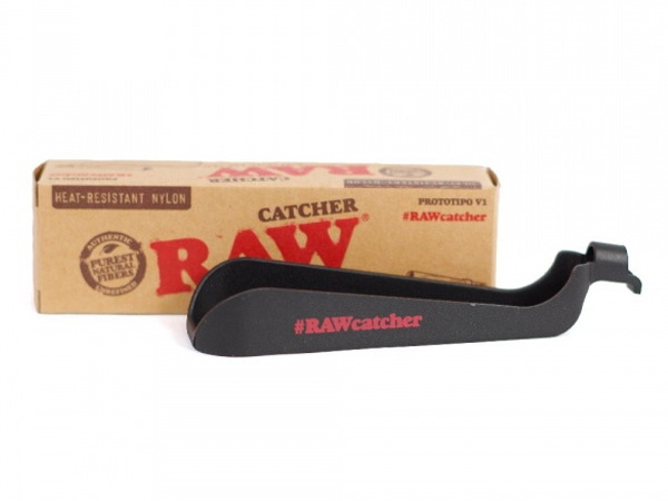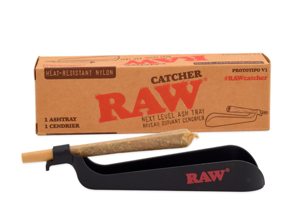 • Cinzeiro preto RAW e embalagem de cartão castanho com texto RAW CATCHER