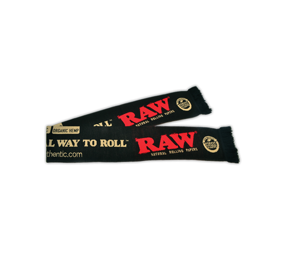 Mantenha-se aquecido com o lenço de inverno RAW. O cachecol bege parece mais uma embalagem de papel RAW, enquanto o cachecol preto possui o logotipo RAW e uma versão maior do selo “Purest Natural Flavors”.