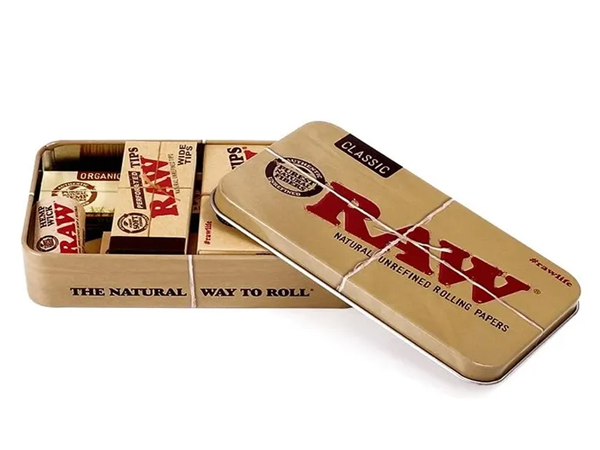 • Conjunto de produtos RAW para enrolar tabaco com caixa metálica e papel rolling