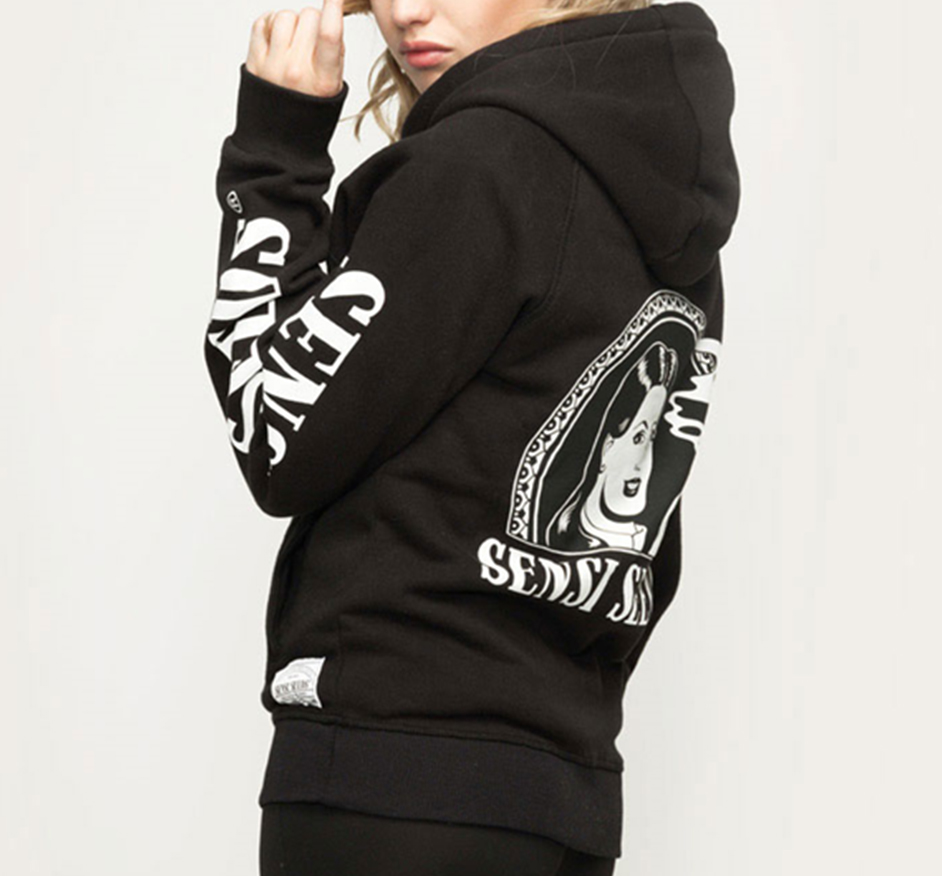 • Pullover com capuz preto com estampas brancas nas mangas e costas