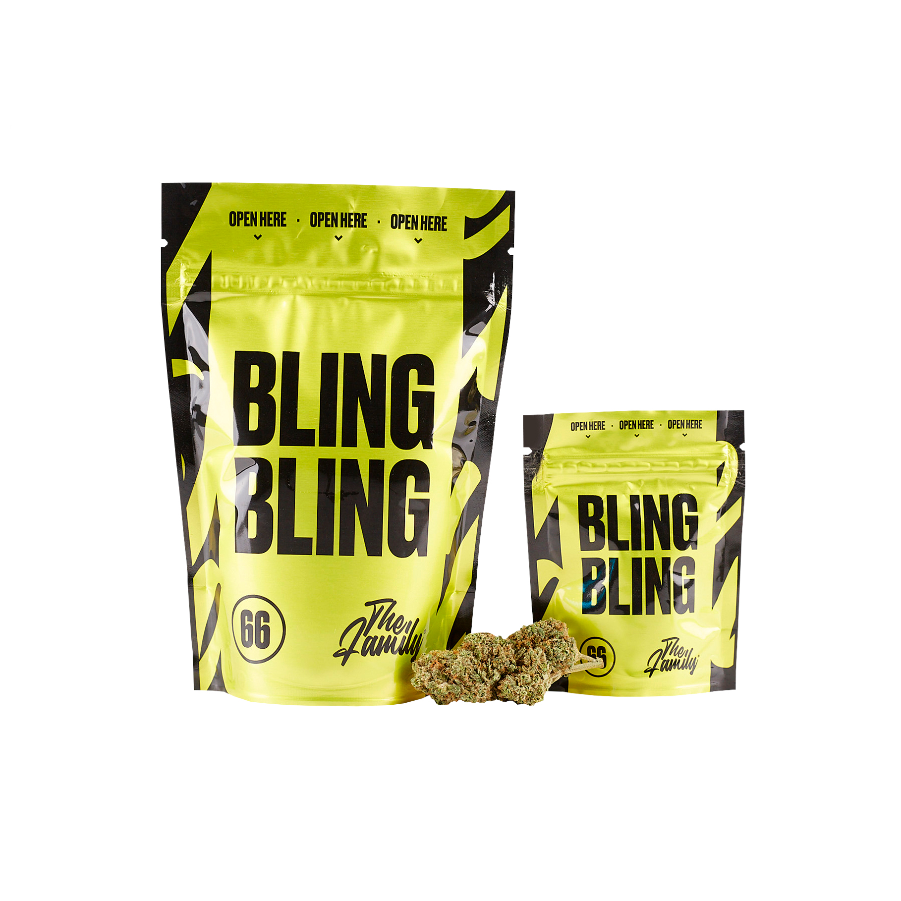 • embalagens amarelas e pretas BLING BLING com produto vegetal seco
