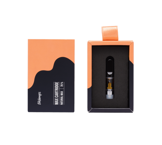 • Cartucho de cera para vaporizador em caixa laranja e preta com texto