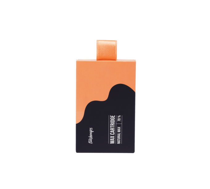 • Embalagem de wax cartridge laranja e preta com texto branco