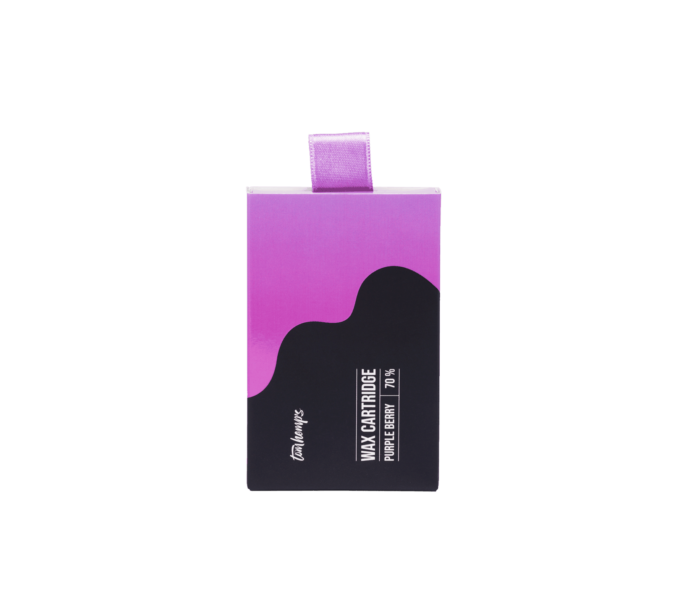 • Embalagem roxa e preta de cartucho de cera com texto branco